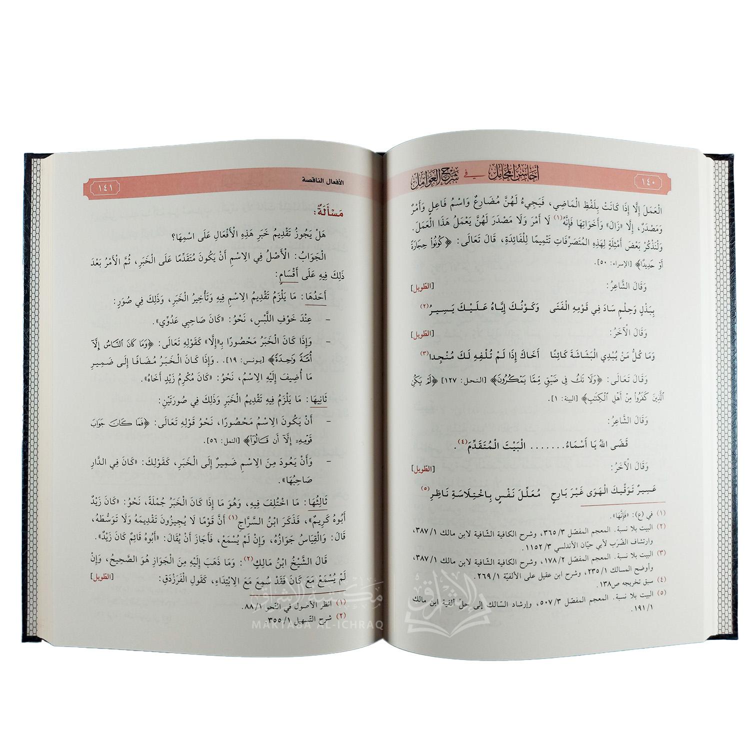 ومن أبرز هذه الشروح كتاب « أحاسن المحامل في شرح العوامل » للإمام ابن أمير الحاج، وهو من العلماء الراسخين في علوم اللغة والفقه. جاء شرحه ليبسط معاني المتن ويوضح العوامل النحوية بأسلوب واضح، بعيد عن التعقيد، مع العناية بالأمثلة، وذكر ضوابط كل عامل، وإيراد الفوائد واللطائف النحوية التي تعين الطالب على الفهم والتطبيق