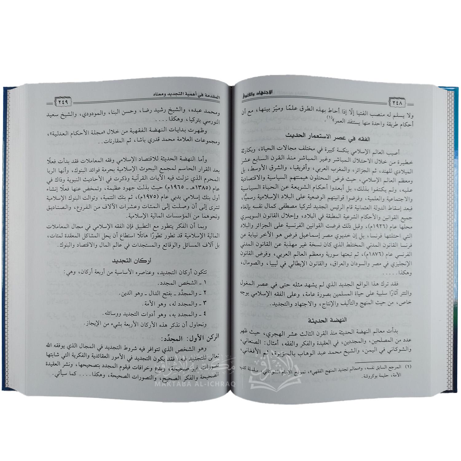 القسم الثاني: الفتوى : يتناول الفتوى من حيث تعريفها لغة واصطلاحًا، وأهميتها ومكانتها في الشريعة، وضوابطها وآدابها وتاريخها ومرجعياتها. ثم يُفصّل الحديث في أركان الفتوى الخمسة : المفتي وطبقات المفتين ومناهجهم، والمستفتي، وموضوع الفتوى، وأدوات الفتوى، وصلة الفتوى بالاجتهاد والمقاصد