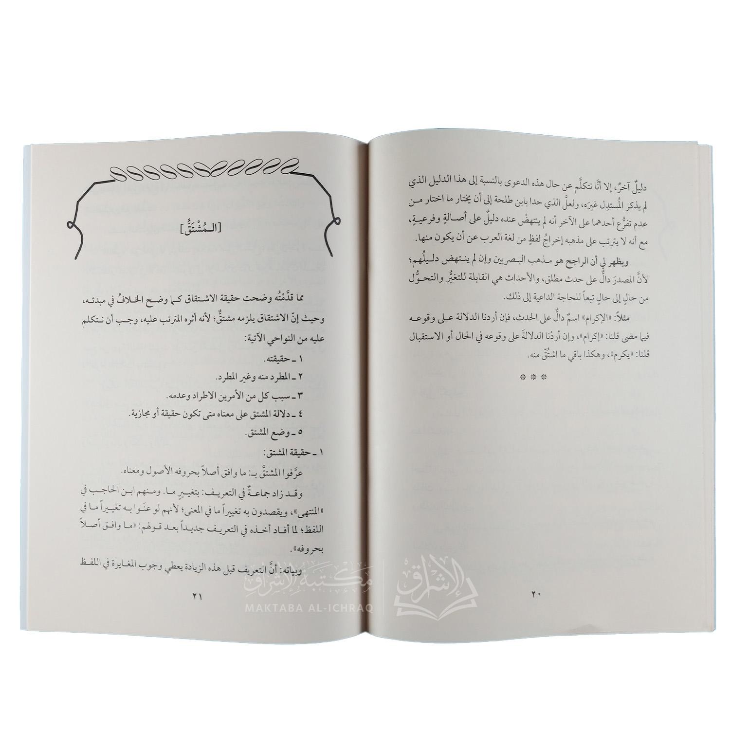 كما ناقش المؤلف مفهوم المشتق، مبينًا أنواعه بين المطرد وغير المطرد، وأسباب الإطراد، والدلالة التي يحملها، مع ربطه بالغاية التعليمية التي تعين الطالب على إدراك الفروق الدقيقة في هذا الباب. جاء الكتاب بأسلوب علمي واضح، يجمع بين الاختصار والدقة، ويهدف إلى تقريب هذا الباب من علم اللغة لطلاب العلم