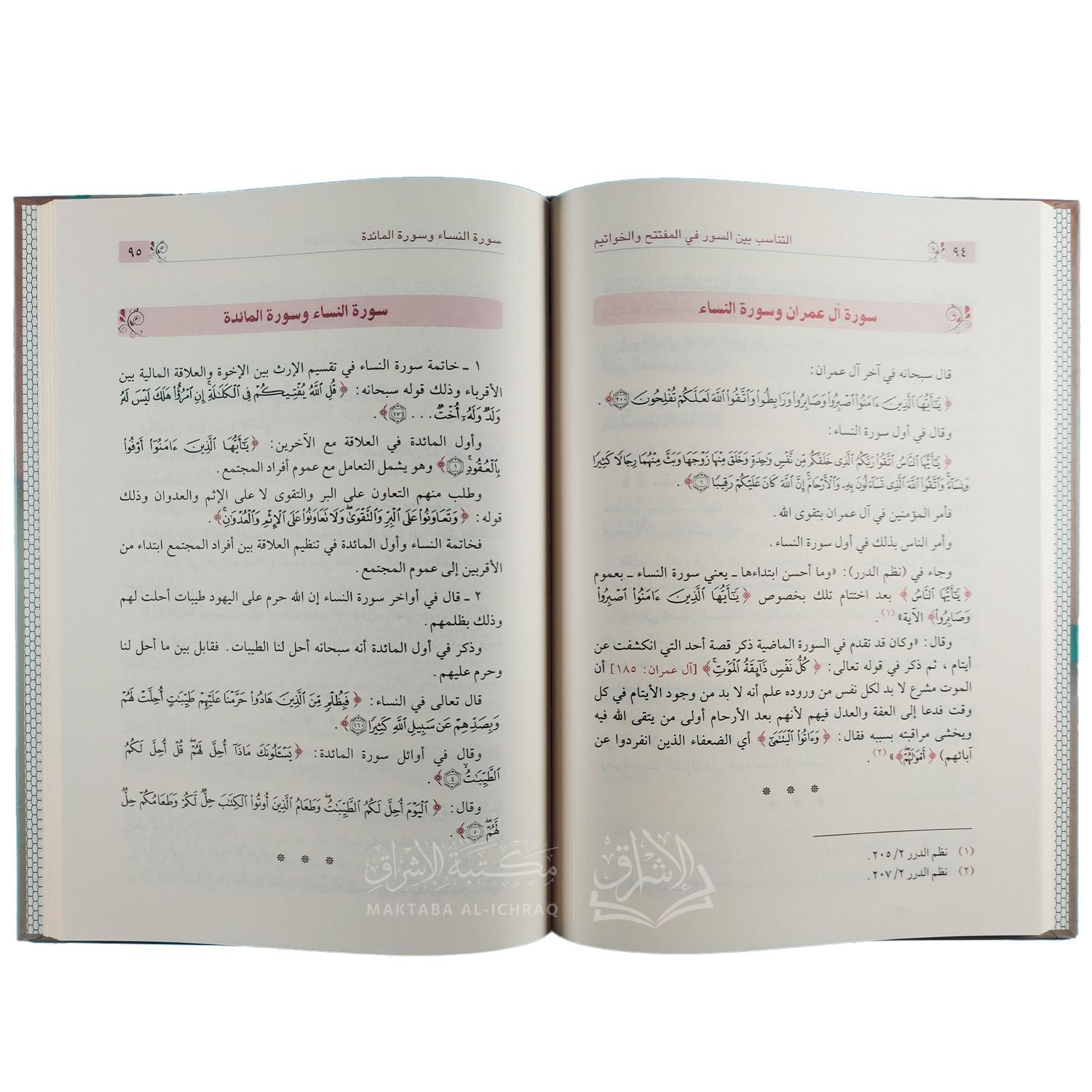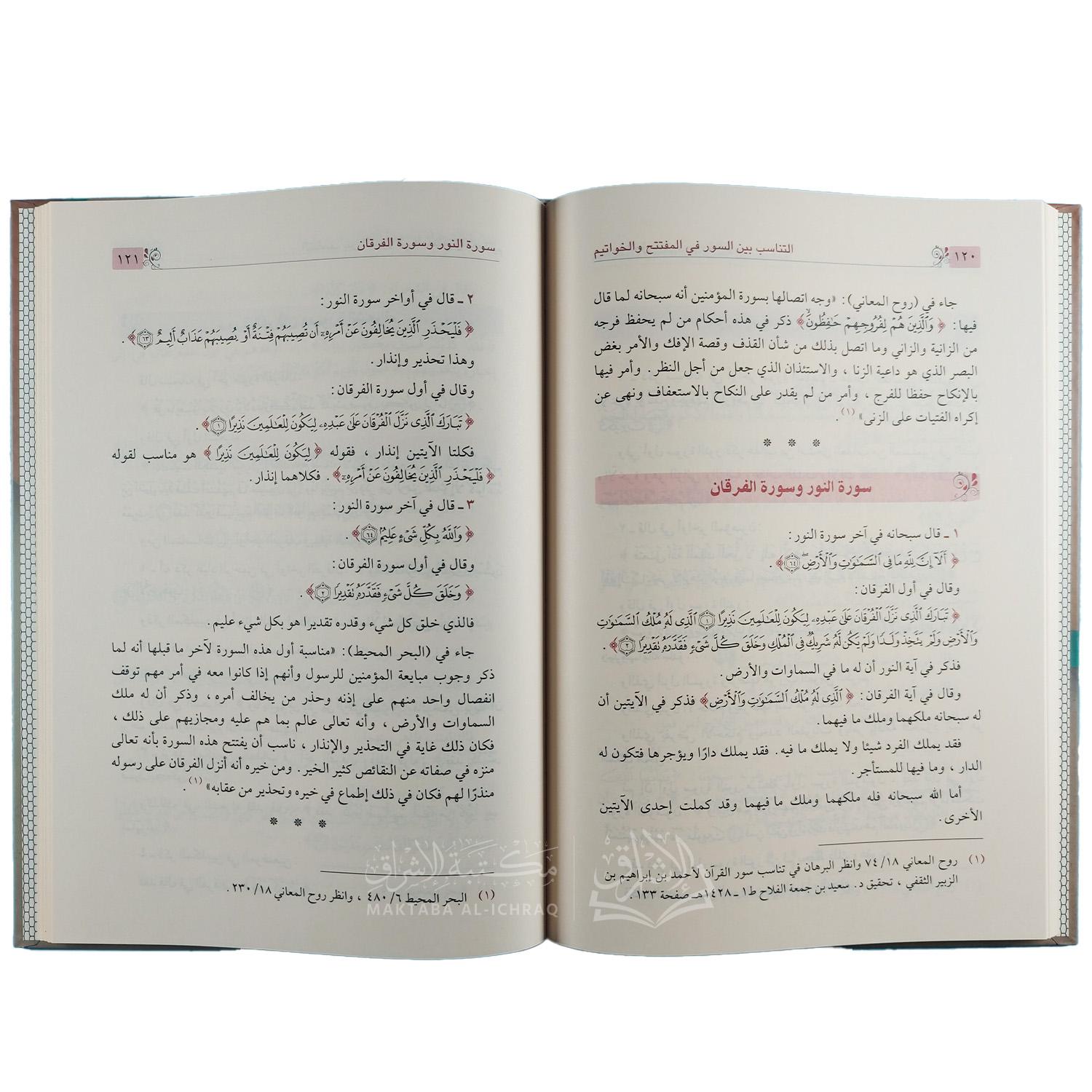 كتاب « التناسب بين السور في المفتتح والخواتيم » للدكتور فاضل صالح السامرائي يُعد من الدراسات المتخصصة في علمٍ من علوم القرآن الجليلة، وهو علم التناسب بين السور والآيات، ذلك العلم الذي يكشف وجهاً من وجوه الإعجاز القرآني، ويُبرز للمتأمل وحدة النص القرآني وتماسكه المحكم، حيث تبدو السور والآيات متراصة في بنية واحدة متكاملة، كأنما هي آية واحدة متصلة في المعنى والهدف والأسلوب
